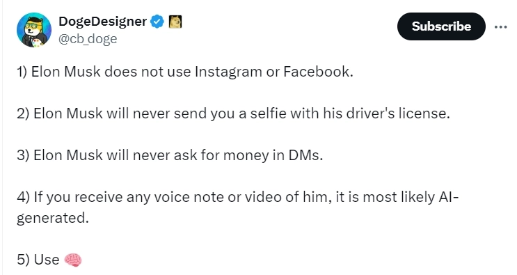 도지코인(DOGE) 재단 소속 UX/UI 및 그래픽 디자이너 '도지디자이너'(DogeDesigner)가 26일(현지시간) 공식 X(구 트위터)를 통해 "X, 엑스AI(xAI, 일론 머스크 테슬라 최고경영자가 설립한 AI 스타트업), 그록(Grok, 엑스AI의 AI 챗봇) 및 테슬라는 어떠한 가상자산(암호화폐) 관련이 없다"라며 "관련 사기를 주의하라"고 경고했다.