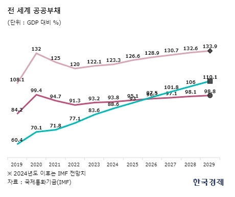 브렌데 총재의 발언은 앞서 국제통화기금(IMF)이 이달 초 발간한 보고서와 궤를 같이한다. 보고에 따르면 지난해 전 세계 공공부채는 GDP 대비 93.2%에 이른다. 코로나19 팬데믹 이전인 2019년(84.2%)보다 약 9%포인트 높은 수준이다. IMF가 전망한 2029년 전 세계 공공부채는 GDP 대비 98.8%로 100%에 육박한다. IMF는 미국과 중국이 공공부채 급증을 이끌었다고 분석했다. 지난 한 해동안 미국과 중국의 부채 규모는 각각 GDP 대비 약 2%포인트, 약 6%포인트가량 늘면서다.