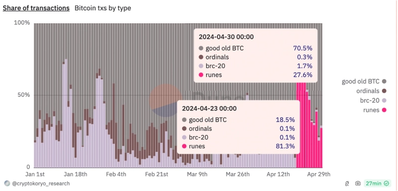 이 같은 현상의 배경에는 새롭게 출시된 룬 프로토콜이 있다는 분석이다. 듄 애널리틱스 데이터에 따르면 23일 룬 프로토콜은 비트코인 네트워크 전체 거래량의 81.3%를 차지하기도 했다. 다만 이날은 비트코인이 네트워크 내 거래량의 대부분인 70.5%를 차지했고, 룬 프로토콜의 점유율은 27.6%에 그쳤다.