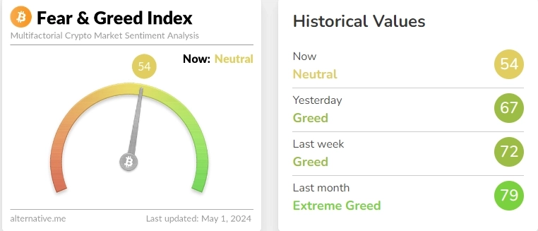 30일(현지시각) 가상자산 분석업체인 얼터너티브(Alternative)가 제공하는 공포·탐욕 지수는 현재 100점 만점 기준 54점으로, 1월 이후에 처음으로 '탐욕' 단계에서 '중립' 단계로 진입했다. 전날 지수는 67점(탐욕)을 기록했다.