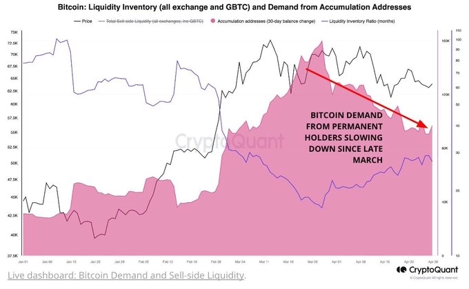 비트코인(BTC)이 최근 6만달러를 반납한 것은 시장 수요가 감소한 영향이라는 분석이 나왔다.
