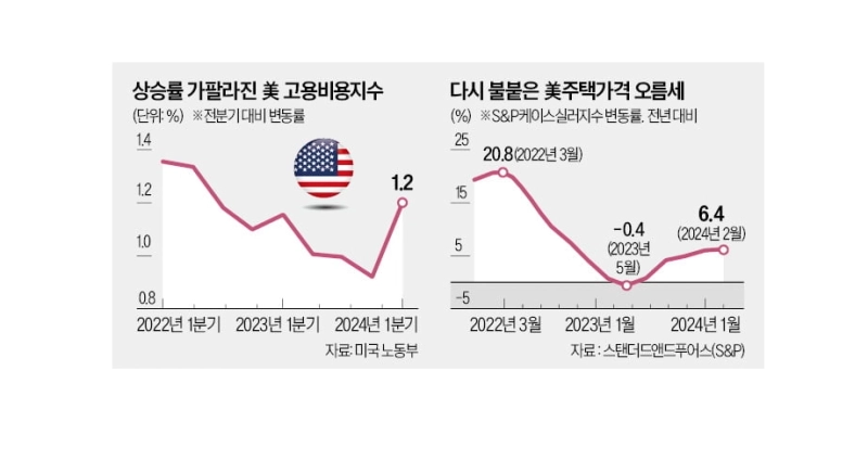 미국의 임금과 주택 가격 등 물가 관련 지표의 상승 폭이 일제히 가팔라졌다. 꺾이지 않는 인플레이션으로 인해 미국 중앙은행(Fed)의 피벗(통화정책 전환) 시기가 점점 더 멀어지고 있다는 관측이 나왔다. 일각에서는 “Fed의 금리 인하 논의가 무기한 중단됐다”는 분석까지 제기됐다.