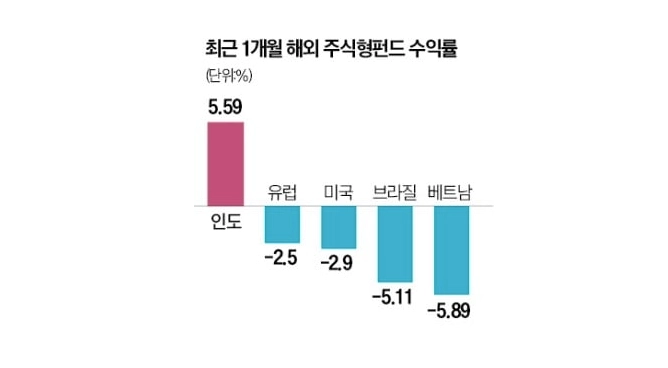 최근 한 달 새 수익률이 특히 두드려졌다. 인도 펀드의 최근 1개월 수익률(5.59%)은 일본(-7.26%), 베트남(-5.89%), 브라질(-5.11%), 미국(-2.9%) 등을 큰 폭으로 웃돌았다.