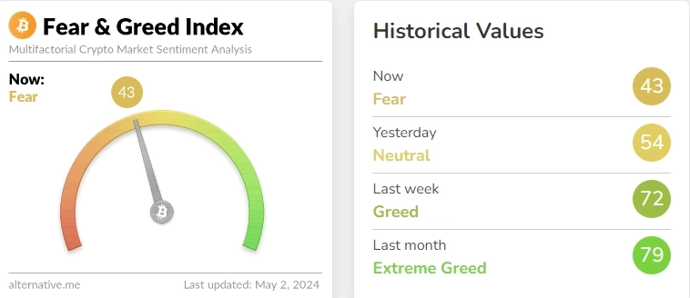1일(현지시각) 가상자산 분석업체인 얼터너티브(Alternative)가 제공하는 공포·탐욕 지수는 현재 100점 만점 기준 43점으로, '중립' 단계에서 '공포' 단계로 진입했다. 전날 지수는 54점(중립)을 기록했다.