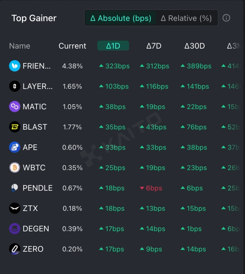 인공지능(AI)기반 웹3 서치 플랫폼 카이토(Kaito)의 토큰 마인드셰어(Token Mindshare, 가상자산 시장 내 특정 토큰의 영향력을 정량화한 지표) 탑게이너에 따르면 4일 현재 사람들이 가장 많이 관심을 보이고 있는 가상자산 관련 키워드 상위 5개는 프렌드테크(FRIEND), 레이어제로(LAYERZERO), 폴리곤(MATIC), 블라스트(BLAST), 에이프코인(APE) 등이다.