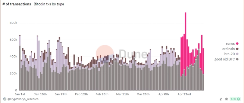 5일(현지시간) 코인텔레그래프는 듄 애널리틱스 데이터를 인용해 "BRC-20 효율성을 높이기 위해 출시된 룬즈 프로토콜은 지난 4월 23일 81.3%의 네트워크 점유율을 기록한 이후 꾸준히 감소세를 기록했으나, 최근 거래 점유율을 회복해 현재 60%의 네트워크 지배율을 기록 중이다"라고 전했다.