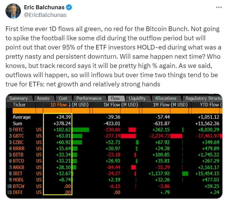 에릭 발추나스 블룸버그 ETF 전문 애널리스트가 6일(현지시간) X(구 트위터)를 통해 "비트코인(BTC) 상장지수펀드(ETF) 투자자의 95% 이상이 시장 하락세에도 불구하고 이를 매도하지 않았다"고 전했다.