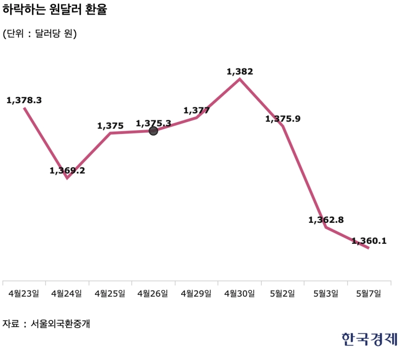 7일 서울 외환시장에서 원·달러 환율은 전 거래일보다 2원70전 하락한 1360원10전에 마감했다. 이날 환율은 6원30전 내린 1356원50전에 거래를 시작했다. 장중 환율이 1350원대로 내려온 것은 지난달 9일(1352원90전) 이후 약 한달 만에 처음이다.