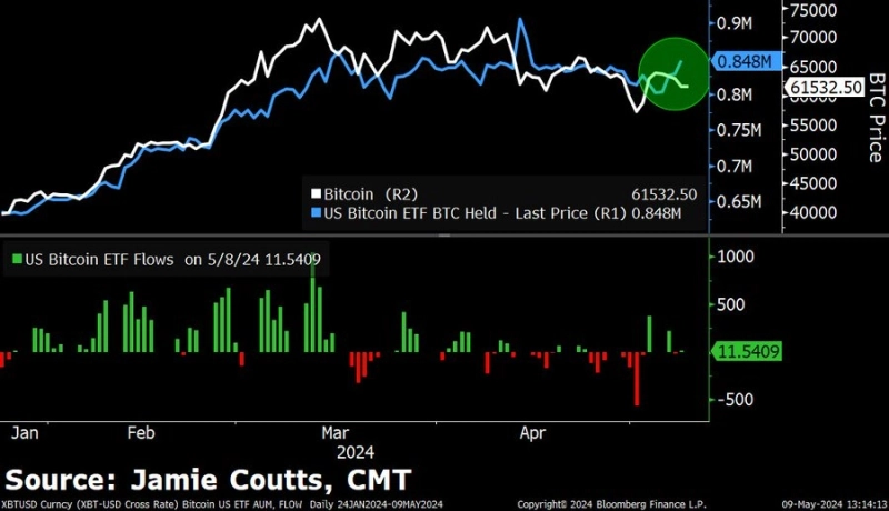 9일 블룸버그 인텔리전스 소속 암호화폐 마켓 애널리스트 제이미 쿠츠(Jamie Coutts)는 X를 통해 "비트코인 가격은 여전히 형편없지만 미국 비트코인 현물 ETF의 비트코인 보유량은 최근 며칠 동안 증가하고 있다"라며 "ETF 투자자들이 저가 매수에 나서고 있다"라고 밝혔다.