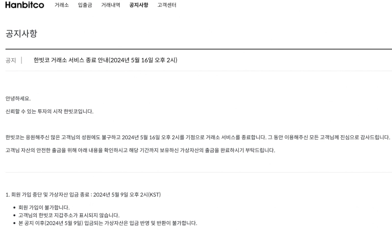한빗코는 "응원해주신 많은 고객님의 성원에도 불구하고 2024년 5월 16일 오후 2시를 기점으로 거래소 서비스를 종료합니다"라며 "고객님 자산의 안전한 출금을 위해 아래 내용을 확인하시고 해당 기간까지 보유하신 가상자산의 출금을 완료하시기 부탁드립니다"라고 전했다.