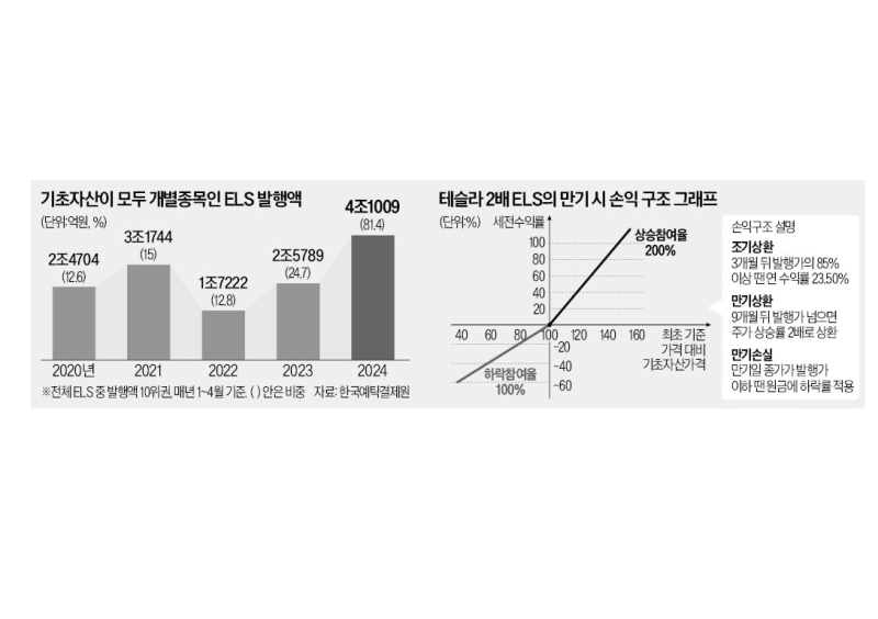 홍콩 H지수 ELS 손실이 도마에 오르면서 전체 ELS 발행액은 올 들어 크게 줄어들었다. 전체 ELS 발행액은 올해 1\~4월 5조349억원으로 지난해 같은 기간 10조4285억원에서 반 토막 났다. 지수형 ELS가 급감하는 가운데 종목형 ELS 발행은 역주행하고 있는 것이다. 종목형 ELS의 비중은 지난해 24.7%에서 올해 81.4%로 세 배 넘게 커졌다.
