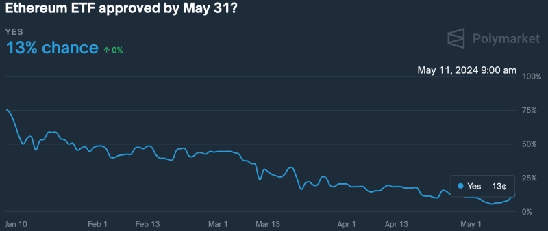 11일 탈중앙화 예측 플랫폼 폴리마켓에 따르면 ‘5월 31일까지 이더리움 현물 ETF가 승인 될까요’라는 베팅에 ‘그렇다’ 예측은 13%다. 이는 지난 6일에 비해 약 2배 정도 높은 수준이다.