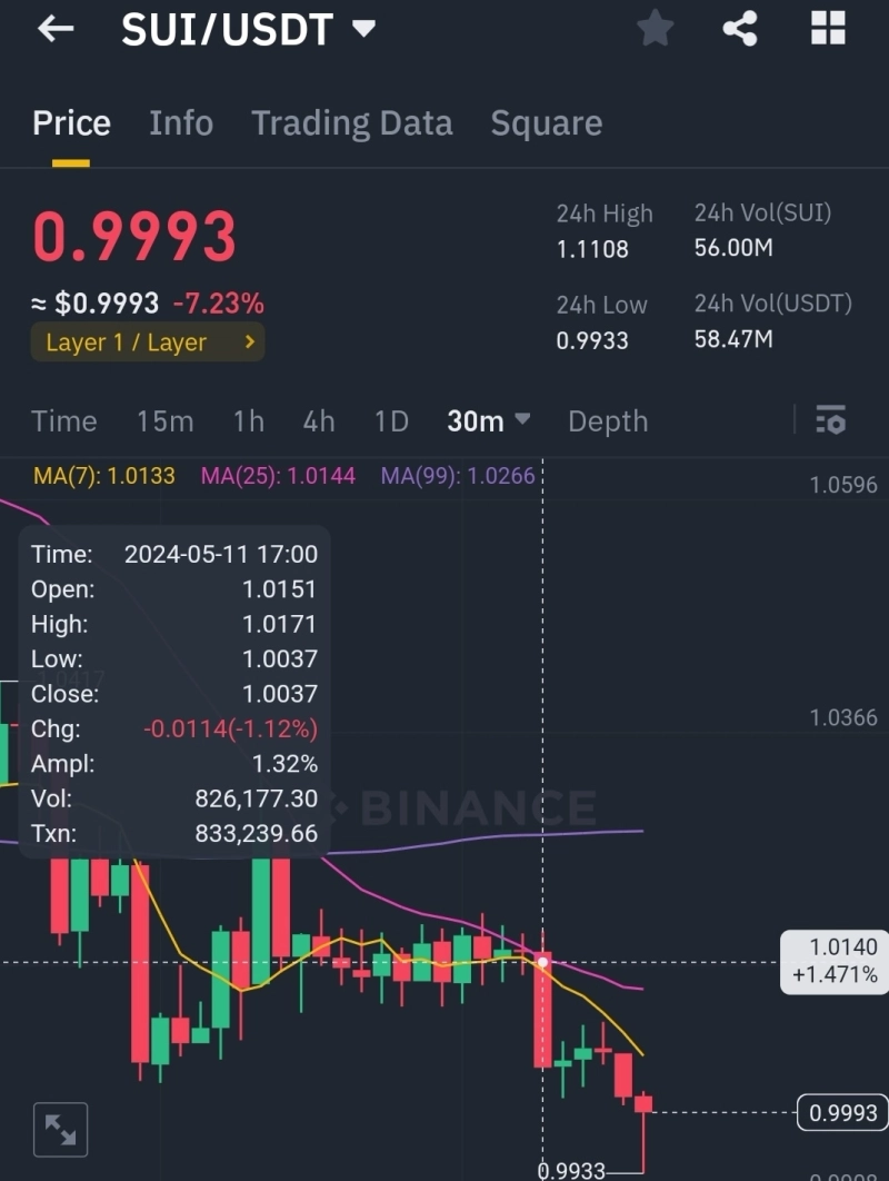 11일 바이낸스 테더(USDT) 마켓 기준 수이는 전일 대비 약 8% 급락한 0.9달러대에 거래되고 있다. 1달러선을 하회한 것은 약 한달만이다.