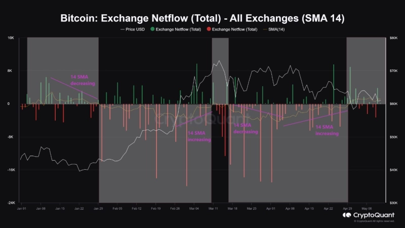 11일 크립토퀀트의 분석가 'burakkesmeci'는 "거래소의 비트코인 순입출금량은 거래소로 입금된 비트코인 양에서 출금된 양을 뺸 값"이라면서 "이 값이 양수이면 거래소의 총 비트코인 보유량이 증가하게 되고 매도압력으로 가격조정이 발생할 수 있다"고 설명했다.