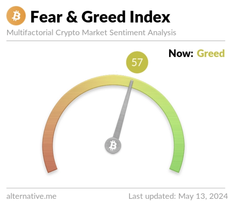 13일(현지시간) 가상자산 데이터 제공 업체 알터너티브 데이터에 따르면 가상자산 공포·탐욕 지수는 전일 대비 1포인트 올라 57을 기록, 탐욕 단계가 지속됐다.