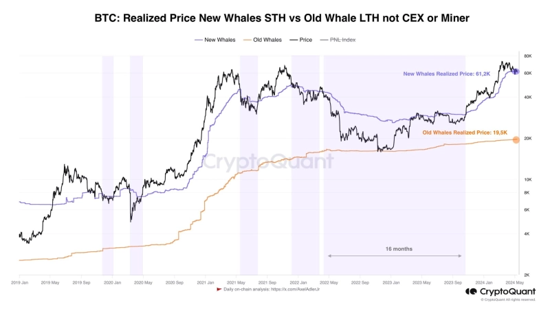 비트코인(BTC)을 155일 미만으로 보유한 새로운 고래 투자자(1000BTC 이상 보유)의 형균 매수 단가가 6만1200달러선인 것으로 나타났다.