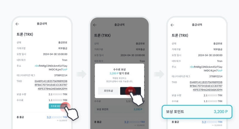 보상 신청은 입출금 메뉴의 출금 상세 화면에서 '수수료 보상 신청'을 눌러 신청할 수 있다. 타 거래소 대비 빗썸의 가상자산 출금 수수료가 높게 적용 됐을 경우, 신청 즉시 포인트를 받을 수 있다. 보상 포인트는 출금 완료 시점의 수수료를 기준으로 산정되며, 포인트샵에서 가상자산 교환 등으로 즉시 이용할 수 있다.