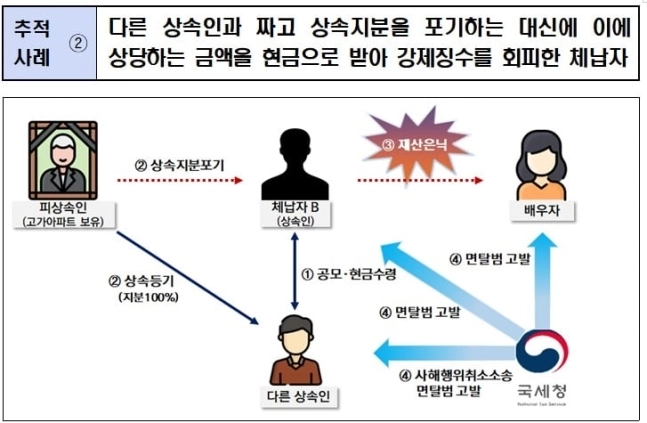 보유하고 있던 토지를 양도한 B씨도 충분한 납부 여력이 있음에도 양도소득세를 내지 않았다. B씨는 자기 모친이 보유한 고가 아파트를 추후 상속받을 경우 과세관청이 이를 압류할 것으로 예상했다. B씨는 모친이 사망하자 형제·자매 등 다른 상속인과 짜고 아파트에 대한 본인의 상속 지분을 포기했다. 대신 다른 상속인으로부터 그에 상응하는 현금을 자신의 배우자에게 지급하는 방식으로 재산을 은닉했다.