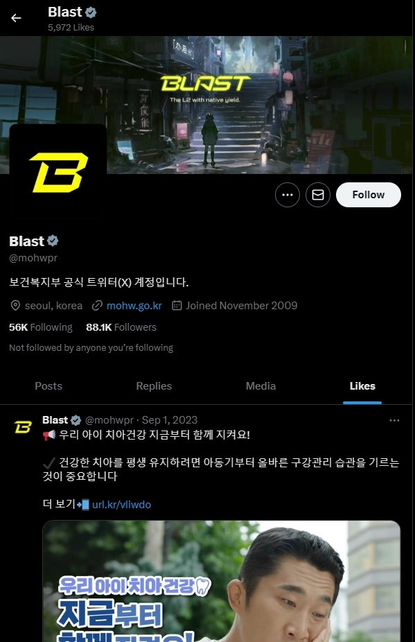 보건복지부의 공식 X 계정이 이더리움 레이어 2 네트워크인 블라스트(BLAST) 이미지로 바뀐 것으로 나타났다.