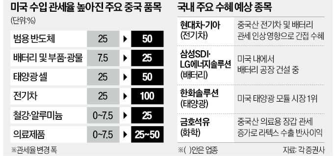 국내 자동차 업종도 장기적으로는 관세 정책 수혜주라는 평가다. 임은영 삼성증권 연구원은 “중국의 저가 전기차 수출이 원천 봉쇄되면서 미국 시장 비중이 높은 현대차·기아가 장기적으로 혜택을 볼 것”이라고 했다.