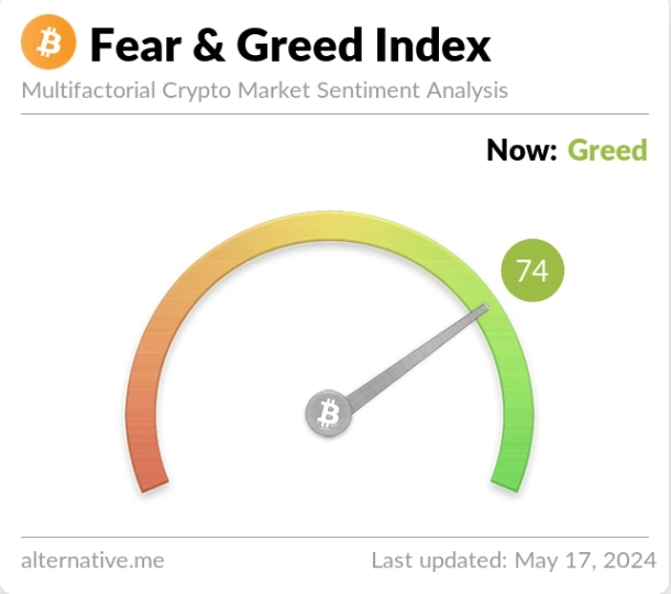 17일(현지시간) 가상자산 데이터 제공 업체 알터너티브의 '공포·탐욕 지수'는 전일 대비 4포인트 오른 74를 기록했다. 투심이 소폭 개선되 이전과 동일한 탐욕 단계를 유지했다.