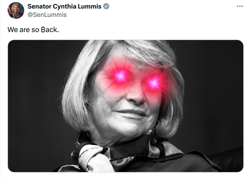 17일 신시아 루미스는 자신의 X(옛 트위터)에 비트코인 지지를 의미하는 레이저 눈 사진과 함께 "우리가 돌아왔다"는 멘트를 적어 올렸다.
