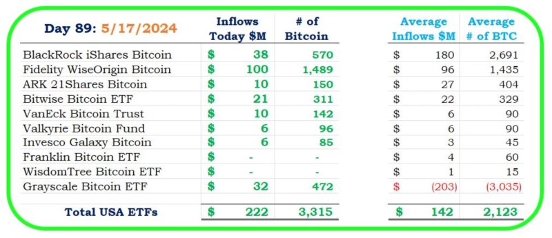 17일(현지시간) HODL15Captial의 X(트위터) 게시물에 따르면 이날 비트코인 현물 ETF에는 2억2200만달러의 순유입이 발생했다.