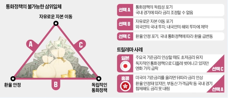 트릴레마란 자유로운 자본 이동, 독립적인 통화정책, 환율 안정(고정환율제) 등 세 가지를 동시에 달성하는 것은 불가능하다는 이론이다. ‘불가능한 삼위일체’라고도 한다. 자유로운 자본 이동과 독립적 통화정책을 선택하는 경우부터 보자. 한국이 그런 나라다. 미국은 경기가 너무 좋아 기준금리를 올렸고, 한국은 경기가 나빠 기준금리를 내렸다고 가정해보자. 미국 기준금리는 연 5%, 한국 기준금리는 연 2%가 됐다.