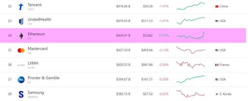 이더리움(ETH)이 지난 밤 급등으로 인해 세계 자산 순위 24위에 등극했다.