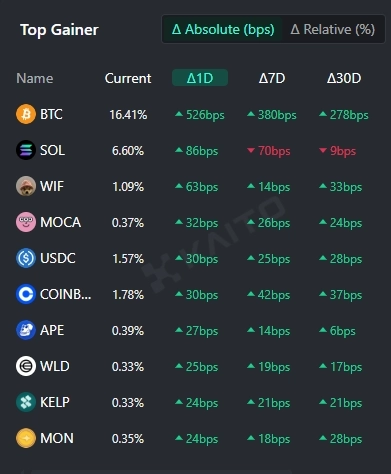 인공지능(AI)기반 웹3 서치 플랫폼 카이토(Kaito)의 토큰 마인드셰어(Token Mindshare, 가상자산 시장 내 특정 토큰의 영향력을 정량화한 지표) 탑게이너에 따르면 23일 현재 사람들이 가장 많이 관심을 보이고 있는 가상자산 종목 상위 5개는 비트코인(BTC), 솔라나(SOL), 도그위프햇(WIF), 모카버스(MOCA), 유에스디코인(USDC) 등이다.