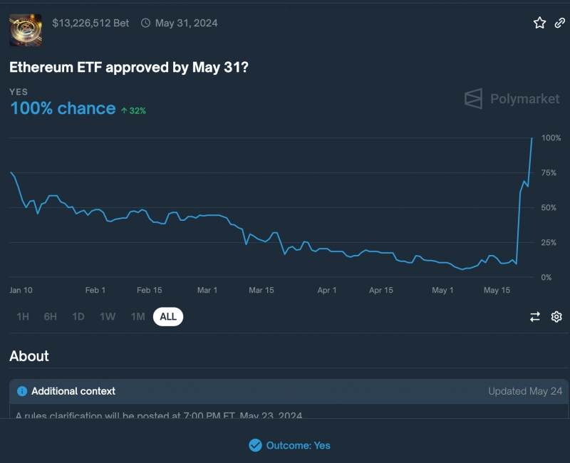 24일 코인텔레그래프에 따르면 폴리마켓에서 진행되고 있던 ‘이더리움의 현물 ETF가 5월 31일 이전에 승인될까’ 투표는 ‘그렇다’로 마감됐다.