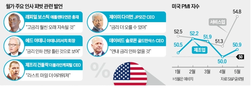 긴축 통화정책이 예상보다 길어질 수 있다는 Fed 인사들의 발언도 이어지고 있다. 래피얼 보스틱 미 애틀랜타연방은행 총재는 이날 스탠퍼드대 경영대학원 학생들과의 토론에서 “정책금리에 대한 민감도가 훨씬 약해졌다”며 “이 때문에 (고금리가) 예상보다 훨씬 오래 지속될 것”이라고 말했다. 주요 7개국(G7) 재무장관·중앙은행 총재 회의 참석차 이탈리아를 방문한 재닛 옐런 미 재무부 장관은 파이낸셜타임스(FT)와의 인터뷰에서 “식료품과 임대료 등 생활비가 큰 폭 상승한 것이 많은 미국민에게 문제가 되고 있다”며 “모기지(주택담보대출) 금리도 높아 젊은이들이 주택 시장에 진입하기 어렵다”고 우려했다. 전날 솔로몬 골드만삭스 최고경영자(CEO)는 “‘제로 컷’(금리 인하하지 않음)을 예상한다”며 “더 끈적끈적하게 고착화된 인플레이션 상황에 있다고 본다”고 말했다.