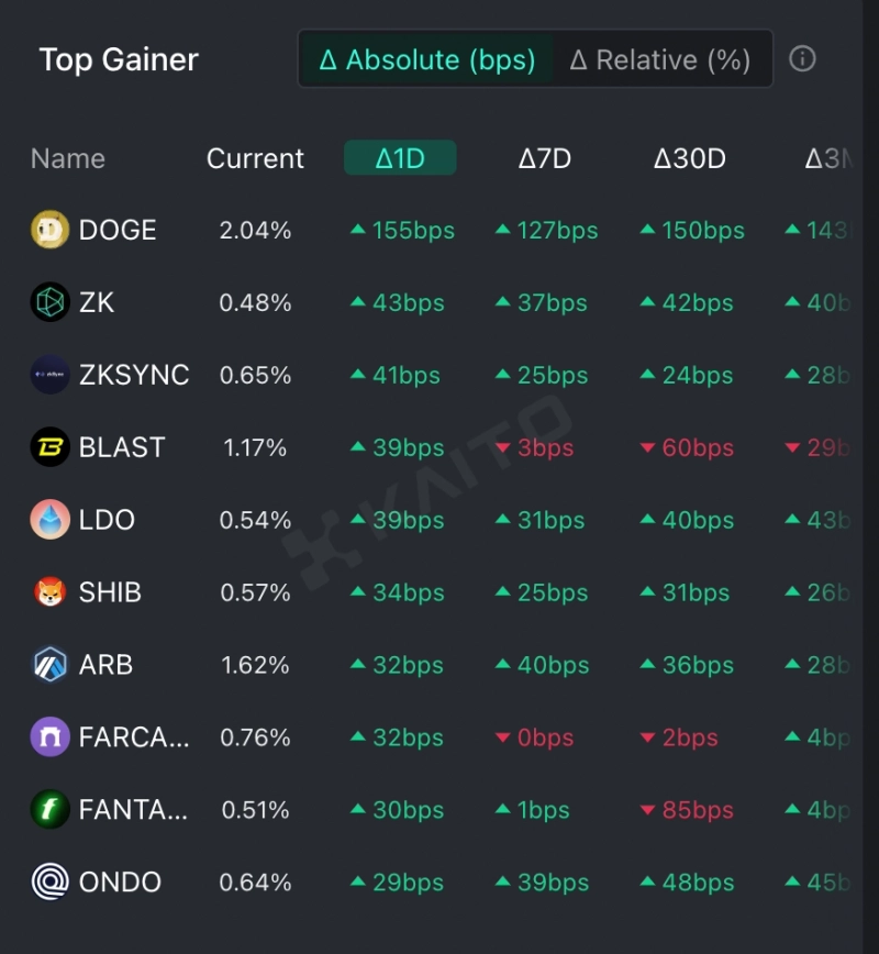 인공지능(AI)기반 웹3 서치 플랫폼 카이토(Kaito)의 토큰 마인드셰어(Token Mindshare, 가상자산 시장 내 특정 토큰의 영향력을 정량화한 지표) 탑게이너에 따르면 25일 현재 사람들이 가장 많이 관심을 보이고 있는 가상자산(암호화폐) 키워드 상위 5개는 도지코인(DOGE), 폴리헤데라네트워크(ZK), 지케이싱크(zkSync), 블라스트(BLAST), 리도다오(LDO) 등이다.