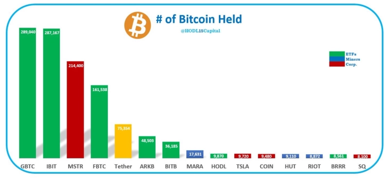 자료에 따르면 GBTC는 28만9040BTC를 보유해 1위를 차지했고, 근소한 차이로 IBIT(28만7167BTC)가 2위를 차지했다. 마이크로스트래티지는 21만4400BTC를 보유해 전체 3위, 사기업 부분에서는 1위를 차지했다. 채굴 기업 중 가장 많은 비트코인을 보유한 곳은 마라톤 디지털 홀딩스로 밝혀졌다.
