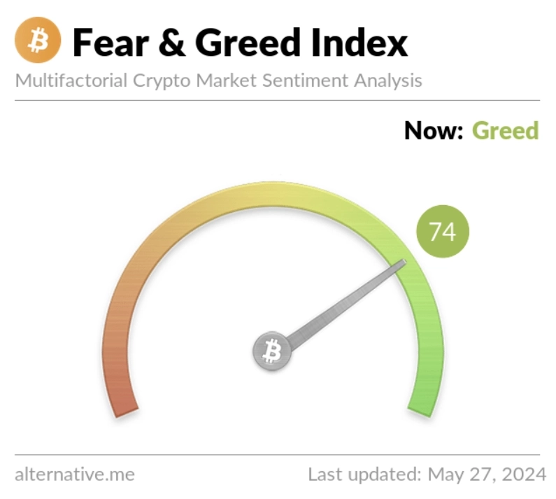 27일(현지시간) 가상자산 데이터 제공 업체 알터너티브(Alternative)에 따르면 이날 가상자산 공포·탐욕 지수는 전일 대비 1포인트 내린 74를 기록하며 탐욕 단계가 지속됐다.