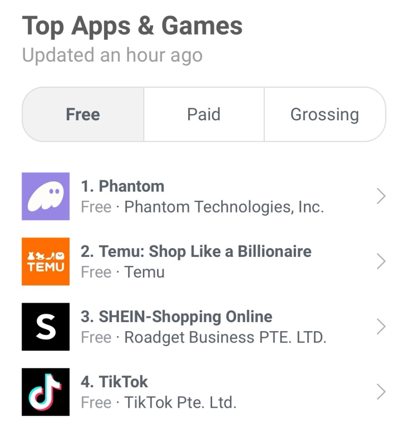 27일(현지시각) 디겐뉴스에 따르면 팬텀은 영국 구글 플레이 스토어 탑 랭킹에서 틱톡과 테무 등을 제치고 1위를 차지했다.