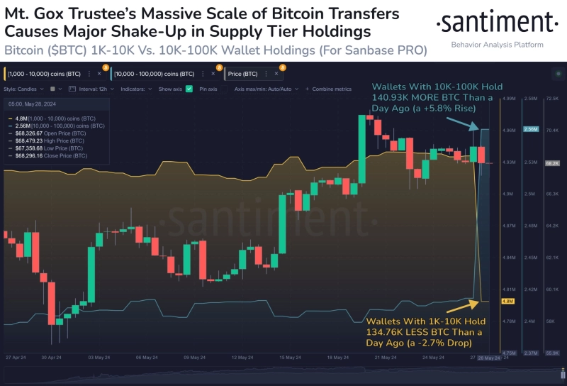 29일(현지시간) 샌티먼트는 X(옛 트위터)를 통해 "마운트곡스가 전송한 수십억달러의 비트코인은 지갑을 통합해 65개의 1000\~1만 BTC 보유 지갑의 순 감소와 3개의 1만\~10만 BTC 보유 지갑의 순 증가에 기여한다. 이는 가격에 큰 영향을 미치지 않을 가능성이 높다"고 전했다.