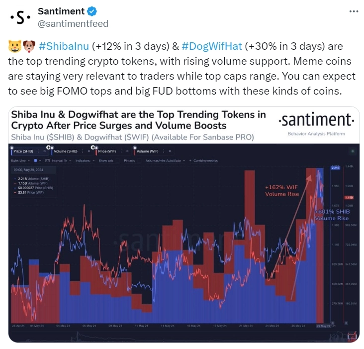 가상자산(암호화폐) 온체인 분석 플랫폼 샌티멘트(Santiment)가 29일(현지시간) X(구 트위터)를 통해 "시바이누(SHIB)와 도그위펫(WIF)은 지난 3일간 거래량이 증가하며 가장 인기 있는 가상자산으로 꼽혔다"고 전했다.
