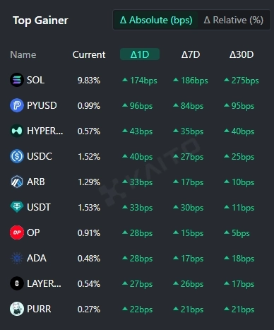 인공지능(AI)기반 웹3 서치 플랫폼 카이토(Kaito)의 토큰 마인드셰어(Token Mindshare, 가상자산 시장 내 특정 토큰의 영향력을 정량화한 지표) 탑게이너에 따르면 30일 현재 사람들이 가장 많이 관심을 보이고 있는 가상자산 종목 상위 5개는 솔라나(SOL), 페이팔USD(PYUSD), 하이퍼리퀴드(HYPERLIQUID), 유에스디코인(USDC), 아비트럼(ARB) 등이다.
