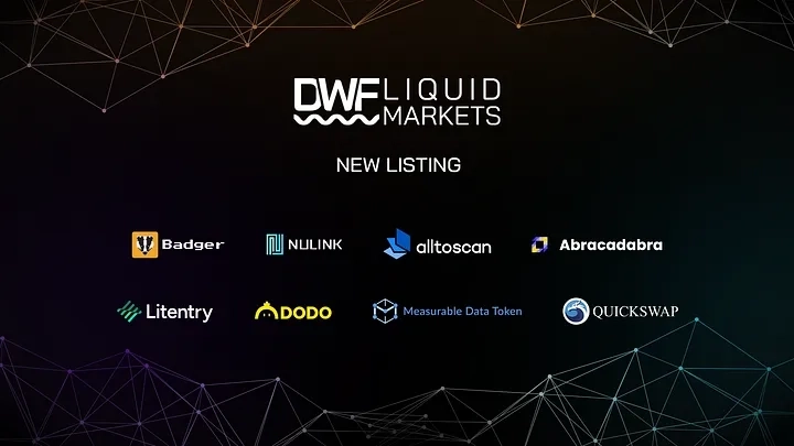 가상자산(암호화폐) 벤처 캐피털(VC) DWF랩스는 가상자산 장외거래(OTC) 플랫폼인 '리퀴드 마켓'이 벳저(BADGER)·누링크(NLK)·올투스캔(ATS)·스펠(SPELL)·리트엔트리(LIT)·도도(DODO)·메저러블데이타(MDT)·퀵스왑(QUICK) 등 8종 가상자산 거래를 지원한다고 밝혔다.