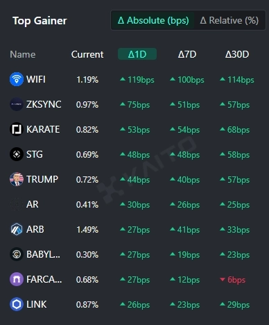 인공지능(AI)기반 웹3 서치 플랫폼 카이토(Kaito)의 토큰 마인드셰어(Token Mindshare, 가상자산 시장 내 특정 토큰의 영향력을 정량화한 지표) 탑게이너에 따르면 31일 현재 사람들이 가장 많이 관심을 보이고 있는 가상자산 종목 상위 5개는 와이파이맵(WIFI), 지케이싱크(ZKSYNC), 가라데 컴뱃(KARATE), 스타게이트 파이낸스(STG), 마가(TRUMP) 등이다.