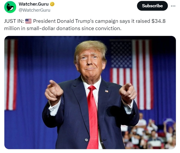 31일(현지시간) 가상자산(암호화폐) 전문 미디어 워처구루가 X(구 트위터)를 통해 "도널드 트럼프 미국 전 대통령 측은 '성추문 입막음' 의혹 사건과 관련해 배심원단으로부터 유죄 평결을 받은 뒤 소액 기부금 3480만달러를 모금했다고 밝혔다"고 전했다.