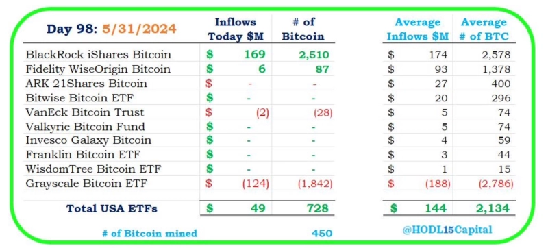 31일(현지시각) 비트코인 분석 계정인 호들캐피털(HODL15Capital)은 X를 통해 "5월 마지막 날에 비트코인 현물 ETF는 4900만 달러가 순유입됐다"라며 "728BTC 수준"이라고 밝혔다.