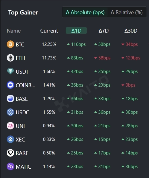 인공지능(AI)기반 웹3 서치 플랫폼 카이토(Kaito)의 토큰 마인드셰어(Token Mindshare, 가상자산 시장 내 특정 토큰의 영향력을 정량화한 지표) 탑게이너에 따르면 1일 현재 사람들이 가장 많이 관심을 보이고 있는 가상자산 종목 상위 5개는 비트코인(BTC), 이더리움(ETH), 테더(USDT), 코인베이스(COINBASE), 베이스(BASE) 등이다.