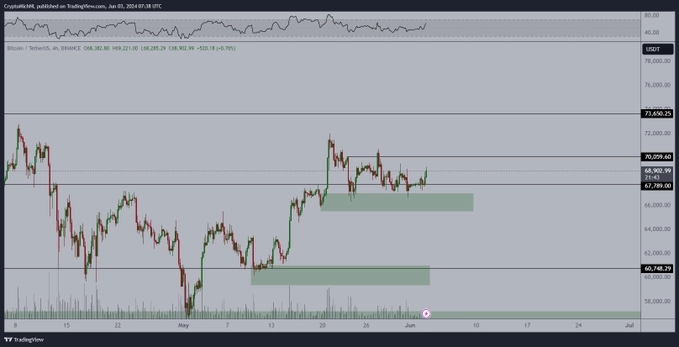 오늘 비트코인(BTC)이 6만9000달러 선까지 단기 반등한 가운데 상승세가 커지려면 7만달러를 확실히 돌파해야 할 것이라는 분석이 나왔다.