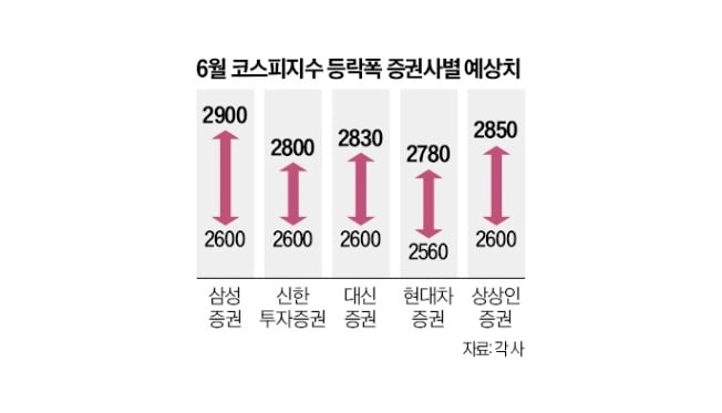 바닥 친 코스피…"이달 중 2800 넘는다"4일 금융투자업계에 따르면 주요 증권사들은 6월 코스피지수의 상단을 평균 2832로 예상했다. 이날 코스피지수가 2662.10에 마감한 점을 고려하면 6.38% 오를 수 있다고 본 것이다. 삼성증권이 가장 높은 코스피지수 2600\~2900을 예상했다. 이어 △신한투자증권 2600\~2800 △상상인증권 2600\~2850 △대신증권 2600\~2830 △현대차증권 2560\~2780 순이었다.
