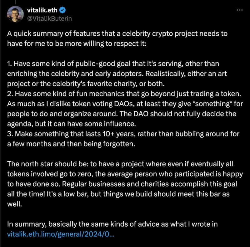 4일(현지시각) 비탈릭 부테린은 X를 통해 "의료, 오픈 소스 소프트웨어, 예술 등 목적이 가치 있는 유명인의 밈코인 출시는 존중할 수 있다"라면서도 "그렇지 않은 목적의 밈코인은 존중할 수 없다"라고 밝혔다.
