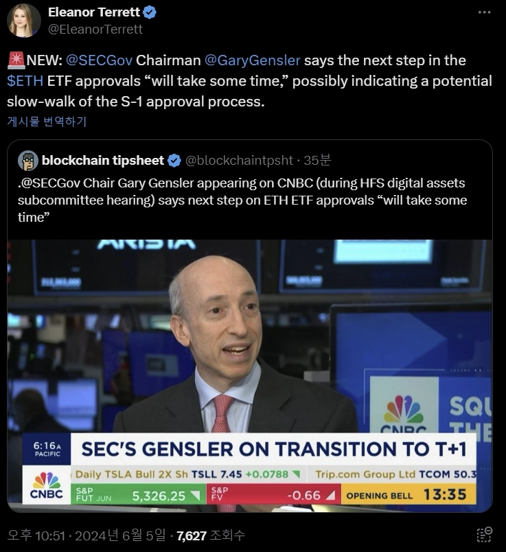 폭스비즈니스 기자 엘리노어 테렛은 5일 X를 통해 “이는 이더리움 현물 ETF 증권신고서(S-1) 승인 프로세스가 지연될 수 있음을 시사한다"라며 이같은 소식을 전했다.