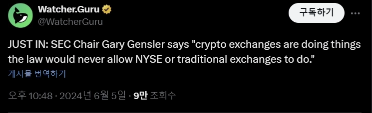5일 워처구루에 따르면 게리 겐슬러 미 증권거래위원회(SEC) 위원장은 CNBC에 출연해 "가상자산 거래소는 법이 뉴욕증권거래소(NYSE)나 기존 거래소에는 결코 허용하지 않는 행위들을 하고 있다"라고 지적했다.