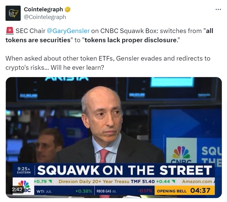 5일(현지시간) 가상자산(암호화폐) 전문 미디어 코인텔레그래프 X(구 트위터) 계정이 "게리 겐슬러 미국 증권거래위원회(SEC) 위원장이 CNBC에 출연해 토큰은 적절한 공시가 부족하다고 말했다"고 전했다.
